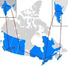 The Amazing Race Canada 3 is the third season of The Amazing Race Canada, a Canadian reality competition show based on the American series The Amazing Race. Hosted by Jon Montgomery, it featured twelve teams of two, each with a pre-existing relationship, in a race across Canada and the world. The grand prize included a CA$250,000 cash payout, "gas for life" from Petro-Canada, the opportunity to fly for a year anywhere Air Canada flies worldwide, and two Chevrolet Colorado "Z71" Trucks.[1] This season visited six provinces and three additional countries and travelled over 48,500 kilometres (30,100 mi) during twelve legs. Starting in Quebec City, racers travelled through Quebec, Ontario, Chile, Argentina, Nova Scotia, Saskatchewan, India, British Columbia, and Alberta before finishing in Whistler, British Columbia. New twists introduced in this season include hiding an Express Pass on the racecourse and the Face Off, where two teams competed against each other in a task. The season premiere aired on CTV on July 8, 2015, with the season finale airing on September 23, 2015.