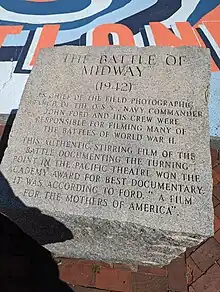When the United States Navy sent director John Ford to Midway Island in 1942, he believed that the military wanted him to make a documentary on life at a small, isolated military base, and filmed casual footage of the sailors and Marines there working and having fun. Two days before the battle, he learned that the Japanese planned to attack the base and that it was preparing to defend itself.[1] Ford's handheld, 16mm footage of the battle was captured totally impromptu. He had been in transit on the island, roused from his bunk by the sounds of the battle, and started filming.[2] Ford was wounded by enemy fire while filming the battle.[3] Acclaimed as a hero when he returned home because of the footage and the minor wound, Ford decades later incorrectly claimed to Peter Bogdanovich that he was the only cameraman; however, Jack Mackenzie Jr. and Kenneth Pier assisted Ford in filming.[1]