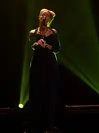 Gerrard possesses the vocal range of a contralto but can also reach upward into the dramatic mezzo-soprano range.[52] She has a vocal range from A2 to F♯5.[53] Her vocal timbre has been described as "rich, deep" which creates a "mournful sound", and her voice is regarded by critics as "simply not of this world".[54] More predominantly, Gerrard's vocal range spans from contralto to dramatic contralto, displayed for examples in "Sanvean",[55] "Sacrifice",[56] "Largo",[57] and "Not Yet";[58] — to the dramatic mezzo-soprano voice in her other songs, such as "The Host of Seraphim",[59] "Elegy",[60] "Space Weaver",[61] and "Come this Way".[62]
