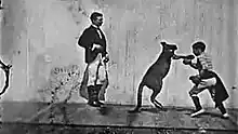 The Boxing Kangaroo is an 1896 British short black-and-white silent documentary film, produced and directed by Birt Acres for exhibition on Robert W. Paul's peep show Kinetoscopes, featuring a young boy boxing with a kangaroo. The film was considered lost until footage from an 1896 Fairground Programme, originally shown in a portable booth at Hull Fair by Midlands photographer George Williams, donated to the National Fairground Archive was identified as being from this film.[1]