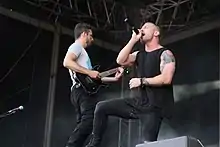 The Dillinger Escape Plan's music is rooted in extreme metal, metalcore and post-hardcore, and draws heavily from progressive rock, electronic music and jazz fusion.[69][99][100][101] They have been characterized as mathcore,[102][103][104] metalcore,[69][105][106][107] progressive metal,[108][109][110][111] experimental metal,[5][112][113] noise metal,[114] noisecore,[115] and jazzcore.[111] Several reviewers have described their early albums as grindcore performed from a technical approach.[116][117][118][119] John Adamian of the Hartford Courant classified Dillinger as "a kind of knotted, complex, abrasive math rock", as well as "prog metal that embraces an avant-garde level of coiled and meshed intricacies."[120] AllMusic writer Ryan Downey describes the group as "maniacally intense", "crushingly metallic", "displaying rigorous physical endurance", while at the same time notes their "precise musicianship" and "meticulously thought-out" compositions.[21] John Adamian commented: "Listening to [The Dillinger Escape Plan] sometimes feels like being ground between a system of elaborate gears. Chromatic turns and cycling patterns notch all the pieces together. The guitars are often dissonant, shifting into double and triple time, with vocals that deliver a blow-torch scorch."[120] After Calculating Infinity, they constantly incorporated new sounds and other styles, "even commercial ones", as Andrew Earles of Spin said, and their albums became "packed with the sometimes brutal, sometimes beautiful music only they play" that "skids from grindcore to progressive jazz and beyond".[121] Some reviewers have compared them with jazz-grindcore project Naked City[120][122] and progressive metal band Meshuggah.[122][123] When asked to define The Dillinger Escape Plan's music, bassist Liam Wilson said: "I usually tell my parents' generation that we sound like what might happen if you took the sophistication of King Crimson and cross-bred us with the snottiness of the Sex Pistols... or 'punk jazz' which is how Jaco Pastorius once described his sound."[124]