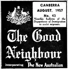 Printed on buff-coloured paper, it contained eight pages of illustrated news and advice for new immigrants to Australia. It was published from August 1950 (No. 1) to October 1969 (No. 189) and was distributed by the Good Neighbour Council.[1] The Good Neighbour also incorporated The New Australian which appeared from January 1949 (No.1) to December 1953 (No. 60).[1]