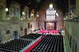 The Great Hall is recognised as one of the finest examples of the Victorian Gothic revival style of architecture in Australia, in a design that reflects, and harmoniously complements the University Quadrangle of which it forms part.[2] A feature of the Great Hall is the sloped roof, built in hammerbeam style to resemble that of Westminster Hall in London.[3] The arched design of the roof is supported by six collar cedar beams, and is architecturally reminiscent of such British interiors as those of Stirling Castle, Hampton Court and Etham Castle, all equally typical of Gothic constructions.