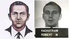 In the 1970s he was a dead-beat dad,[3] four-time felon, escape artist and state prison convict.[7] It was during two fugitive runs in 1978 that the FBI Cooper task force first became aware of Rackstraw. Both getaways involved planes: one was a flight to Iran, the other a faking of his own death in a mayday crash over Monterey Bay.[8] Local police alerted the FBI to his resemblance to Cooper composite sketches, his military skill sets, and criminal record (aircraft theft, possession of explosives, check kiting and bank fraud). Special agents eliminated him as a hijack suspect in 1979 after no direct evidence of his involvement could be found.[9][10]