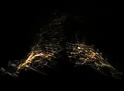 The OpenEnded Group has also created many large public art installations. Pedestrian (2002) projected virtual figures directly on city sidewalks.[9] Successive commissions by the Mostly Mozart Festival of Lincoln Center placed two works outside Avery Fisher Hall: Enlightenment (2006) [10] and Breath (2007). Recovered Light (2007) illuminated the eastern facade of the York Minster with live reconstructions of the underlying stained glass.[11]