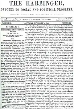 After Brook Farm's dissolution, the publication was eventually moved to New York City under the editorial control of George Ripley and Charles Anderson Dana where it continued weekly until October 1847.[2] In addition to Ripley and Dana, early contributors to The Harbinger included Parke Godwin, James Russell Lowell, William Wetmore Story, John Greenleaf Whittier, and Nathaniel Parker Willis.[4] Edgar Allan Poe, who strongly distrusted the Utopian movements, referred to The Harbinger as "the most reputable organ of the Crazyites".[5]