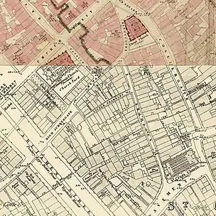 The 1940s and 1950s were a period when the Shambles was subject to a lot of change. After the Second World War, the street was targeted by city planners who wanted to make improvements to the buildings which by that time were in urgent need of restoration. York City Council purchased numerous properties from private owners and, during the 1950s, they extensively altered and rebuilt many buildings and demolished large sections of the area, including the entirety of Little Shambles, a short street that led west off the centre which was considered to be beyond repair. A chapel called Holy Trinity Christ Church was at the heart of King's Square until it was demolished in 1937.[7] Today, some of these restorations are seen as insensitive, since a great deal of historic fabric, including slaughterhouses and outbuildings at the rear of the properties, was demolished. The Yorkshire Architectural and York Archaeological Society's annual report of 1949 contains plans of The Shambles showing the buildings to be removed.[8]
