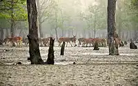 Despite the protected status, the Indian Sundarbans were considered endangered in a 2020 assessment under the IUCN Red List of Ecosystems framework.[5] The Sundarbans mangrove forest covers an area of about 10,000 km2 (3,900 sq mi), of which forests in Bangladesh's Khulna Division extend over 6,517 km2 (2,516 sq mi) and in West Bengal, they extend over 3,483 km2 (1,345 sq mi) across the South 24 Parganas and North 24 Parganas districts.[6] The most abundant tree species are sundri (Heritiera fomes) and gewa (Excoecaria agallocha). The forests provide habitat to 453 fauna wildlife, including 290 bird, 120 fish, 42 mammal, 35 reptile and eight amphibian species.[7] Despite a total ban on all killing or capture of wildlife other than fish and some invertebrates, there has been a consistent pattern of depleted biodiversity or loss of species in the 20th century, with the ecological quality of the forest declining.[8]