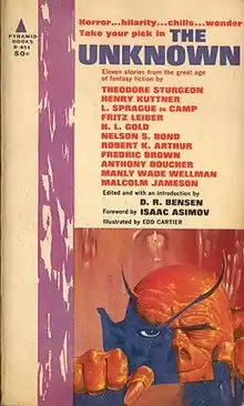 The Unknown is an anthology of fantasy fiction short stories edited by D. R. Bensen and illustrated by Edd Cartier, the second of a number of anthologies drawing their contents from the American magazine Unknown of the 1930s-1940s. It was first published in paperback by Pyramid Books in April 1963. It was reprinted by the same publisher in October 1970, and by Jove/HBJ in August 1978[1] A companion anthology, The Unknown Five, was issued in 1964.