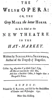 The expanded version of the play, The Grub-Street Opera, was not put on for an audience, which provoked E. Rayner to print The Welsh Opera without Fielding's consent.[2] On 26 June 1731, the Daily Journal announced that E. Rayner and H. Cook published an edition of The Welsh Opera, which was followed by an announcement in the 28 June 1731 Daily Post:
