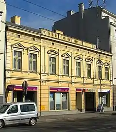 This tenement stands at the corner of Jagiellońska street and Theatre Square. From 1789 to 1800, on the place stood a storehouse and a stable. In 1853, a new building was erected, it survived until 1912. This year, a new edifice has been built by Rudolf Kern following a design of architect Heinrich Gross: the client was Otto Pfefferkorn, owner of a successful furniture factory.[8][10] Minor works have been performed in 1922-1923. In 1940, arcades designed by Jan Kossowski have been added at ground level at the request of the Nazi authorities: the project comprised also the opposite building with the same features.