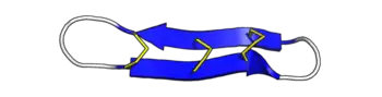 θ-defensins are cyclic peptides of 18 amino acids (~2 kDa), possessing antimicrobial activity against a range of Gram-positive and Gram-negative bacteria, fungi, and some retroviruses.[4][5][6][7] They consist of a pair of antiparallel β-sheets linked by three disulfide bonds arranged as a ladder along the sheets to form an extremely stable structure. Additionally, the peptides may self-associate into trimers.[8]