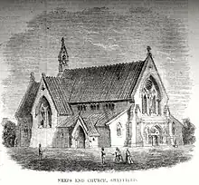 St Michael and All Angels, Neepsend, was consecrated in November 1867.[53] It was built for the Church Extension Society,[2] in an area with a background of severe flood, poverty, dirt and smoke, and was "therefore ... very plain in character". The nave was 90 ft (27 m) long, and 60 ft (18 m) wide, including the aisles, and contained seating for 1,000. The font, the carving and the heating apparatus were gifts from local worthies. The Illustrated London News said:[53]