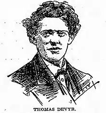 Thomas Devyr was born in about 1844 in Brooklyn, New York.[1] His father was Thomas Ainge Devyr, an Irish political journalist and activist involved in the Chartism movement in Ireland. In 1840, he and his family fled the country to the United States when threatened with imprisonment.[1] The family settled into Williamsburg neighborhood of Brooklyn, New York,[2] where the elder Thomas became an influential progressive writer and newspaper editor.[1] He founded the first daily newspaper in the area's history, the Williamsburgh Daily Post.[2] The Devyr family included five sons, and two daughters,[2] and younger Thomas' middle initial has been noted as either an A or an H, depending on the source.[1]