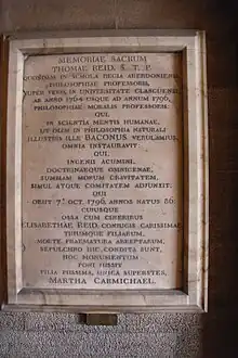 Memoriae sacrum THOMAE REID, S.T.P., quondam in Schola Regia Aberdonensi Philosophiae Professoris; nuper vero, in Universitate Glasguensi, ab anno 1764 usque ad annum 1796, Phi1osophiae Moralis Professoris; qui in Scientia Mentis Humanae, ut olim in Philosophia Naturali illustris ille Baconus Verulamius, omnia instauravit; qui ingenii acumini, doctrinaeque omnigenae, summam morum gravitatem, simul atque comitatem, adjunxit; qui obiit 7th October, 1796, annos natus 86. Cujusque ossa cum cineribus ELIZABETHAE REID, conjugis carissimae, triumque filiarum, morte praematura abreptarum, sepulchro hic condita sunt, hoc Monumentum poni jussit filia piissima, unica superstes, Martha Carmichael."[2]