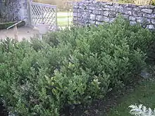 The woodland policies contain a mixture of mature oak, Norway maple, beech, copper beech, willow, horse chestnut, aspen, rhododendron, Scots pine, alder, ash, elm, monkey puzzle, willow, sycamore, holy, elder, yew, lime, hawthorn, blackthorn and other species. The woodland floor has drifts of snowdrops, bluebells and some primroses, together with ground ivy, bird's-foot trefoil, coltsfoot, three-veined sandwort, vetch, ladys mantle, red campion, bistort, foxgloves, tuberous comfrey, ivy, yellow saxifrage, pendulous sedge, brambles, etc. An area of the woodland is a genuine 'bluebell wood.' The large leaved Persian Ivy (Hedera colchica)[15] grows at the walled garden, a relict of the exotic plantings of yesteryear, as is the very unusual stand of Butcher's Broom. The ground flora of the Thorntoun policies is typical of the semi-natural diversity of many deciduous woodlands in Ayrshire, particularly of those associated with current or previous country estates. The bird fauna is quite diverse, including pigeons, rooks, starlings, blackbirds, kestrels, etc. Hedgehogs are present (2007).