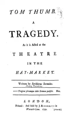 Tom Thumb is a play written by Henry Fielding as an addition to The Author's Farce. It was added on 24 April 1730 at Haymarket. It is a low tragedy about a character who is small in both size and status who is granted the hand of a princess in marriage. This infuriates the queen and a member of the court and the play chronicles their attempts to ruin the marriage.