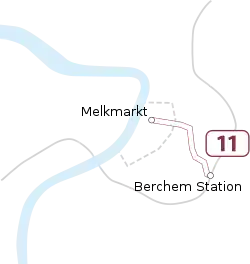 Tram route 11 is an above ground tram route in the city of Antwerp, Belgium. It currently runs between the Antwerpen-Berchem railway station and the Melkmarkt in the city centre.