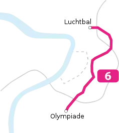 Tram route 6 begins at the Metropolis P+R next to the Metropolis cinema complex in the southern part of the Luchtbal suburb. The route then uses the Groenendaallaan and Delbekelaan, before arriving at the Gabriel Theunis bridge over the Albert canal. After crossing the canal, the route enters the pre-metro network, which it uses between Sport to the north and Plantin to the south. After coming above ground near the Charlottalei, it follows the Belgielei to the Harmonie park, and then the Jan van Rijswijcklaan to its terminus Olympiade in the Kiel neighborhood.[1]