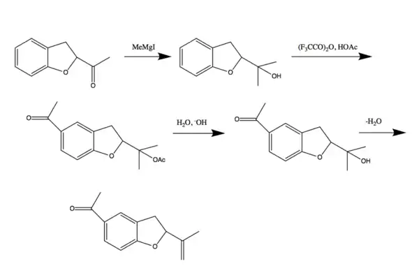 Tremetol, an oil with a straw-colored tinge, was first isolated from white snakeroot by J.F. Couch in 1929. Column chromatography of tremetol yielded a hydrocarbon, two steroids, and three ketones. Further isolation experiments revealed that tremetone is the major ketone constituent of the compound tremetol. Hence, tremetone was hypothesized to be responsible for the “trembles” that characterize the milk sickness disease. Tremetone was first synthesized in July 1963 by DeGraw, Bowen, and Bonner.[6] This synthesis is illustrated below. The final dehydration step was accomplished by treatment with phosphoryl chloride/pyridine at 75 °C.