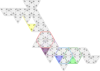 A triomino tile is in the shape of an equilateral triangle approximately 1 in (2.5 cm) on each side and approximately 1⁄4 in (6.4 mm) thick. Each point of the triangle has a number (most often from 0 to 5, as in the Pressman version),[2] and each triomino has a unique combination of numbers, subject to the following restrictions: