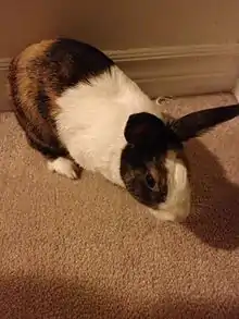 The Tri-Colour Dutch (also known as the Japanese Dutch or Harlequin Dutch) is a breed of domestic rabbit created in the Netherlands[1] by crossing tortoiseshell Dutch rabbits with Harlequin rabbits. The Tri-Colour Dutch breed is recognized by the British Rabbit Council[2] but not by the American Rabbit Breeders Association (although there are breeders of Harlequin Dutch rabbits in the USA). The coat of the Tri-Colour Dutch is white in the same places as a Dutch rabbit, but the coloured portions of the coat are a mix of orange with either black, blue or chocolate.