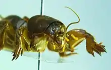 The mole cricket was well known to Māori, who encountered it when cultivating garden plots and called it honi.[2] Mole crickets collected in New Zealand were assumed to be the European species Gryllotalpa vulgaris (a synonym of Gryllotalpa gryllotalpa), which has a wingless nymph that resembles the adult New Zealand species.[3] Triamescaptor aotea was named and described by Norman Tindale in 1928 from two specimens collected in 1915 at Aramoho, Whanganui.[1] It is the only species in its genus, and the only genus in tribe Triamescaptorini.[4] Its closest relatives are two Australian species of Gryllotalpa.[5] Triamescaptor is sometimes incorrectly spelled "Trimescaptor" in later publications.[6]