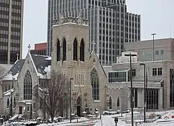 Trinity Cathedral is located in Downtown Omaha, Nebraska. Nebraska's first Episcopal parish, Trinity was established in 1856, and became the state's first Episcopal cathedral in 1872. Designed by noted English architect Henry G. Harrison in 1880, the cathedral was consecrated on November 15, 1883. It was added to the National Register of Historic Places in 1974.[2][3] Today Trinity Cathedral is considered one of the most beautiful churches in Omaha.[4]