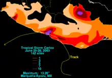 - 1 2 Staff Writer (2003-06-30). "Tropical Storm Carlos kills seven in Mexico". Deutsche Presse-Agentur.