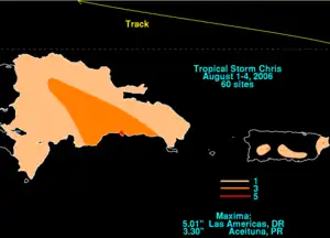 Rainfall reached up to 2 inches (50 mm) across portions of Hispaniola, the Turks and Caicos, the Bahamas, and eastern Cuba, and reached 4 inches (100 mm) in some mountainous areas.[25] In Santo Domingo in the Dominican Republic, heavy rainfall caused severe flooding. Las Américas reported 5.01 inches (127 mm) of rainfall from Chris.[26] Several people were left temporarily homeless due to flooding entering their households. The flooding left many roads impassable near the capital city, and also resulted in landslides.[27] The flooding also covered rice fields in the northeastern portion of the country. The National Office of Meteorology issued flood warnings for residents in low-lying areas and near rivers in the northeast and southeast portions of the country. Despite the flooding, overall damage was minor, and there are no casualties associated with Chris.[28]