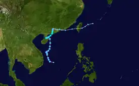The subtropical ridge steering the storm collapsed thereafter, leaving Ewiniar in a zone of weak steering currents over the Qiongzhou Strait.[10] The system made landfall in Xuwen, Guangdong, at 22:25 UTC on June 5, before turning southwest and making another landfall in Haikou, Hainan, at 06:50 UTC on June 6.[11] While over the Leizhou Peninsula, the JTWC assessed that Ewiniar weakened back into a tropical depression,[3] whereas the JMA maintained the system at tropical storm intensity.[4] On June 7, Ewiniar finally began to accelerate east-northeastwards ahead of a shortwave trough. This moved Ewiniar back over water and allowed it to restrengthen,[12] reaching peak intensity with maximum sustained winds of 75 km/h (47 mph) and a minimum pressure of 998 hPa (mbar; 29.57 inHg) at 06:00 UTC.[4][3] Ewiniar then turned to the north-northeast as it began to interact with the Meiyu front,[13] before making a third landfall in Yangjiang, Guangdong, at 12:30 UTC June 7.[11] Once inland, the system soon became embedded within the Meiyu front and the JTWC declared that Ewiniar dissipated as a tropical cyclone near midday on June 8.[14][3] The JMA, however, continued to track Ewiniar as a tropical depression while the system turned back east and emerged over the South China Sea on June 10. After crossing Taiwan on June 11, Ewiniar was finally declared to have dissipated by the JMA.[4]