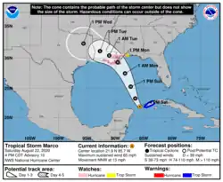 - ↑ Whitfield, Kyle (August 22, 2020). "Evacuations announced ahead of Tropical Storm Marco: see a list". nola.com. Archived from the original on August 24, 2020. Retrieved August 25, 2020.