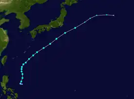 - ↑ All winds are in 10-minute sustained standards, as per the Japan Meteorological Agency,[4] unless otherwise stated.