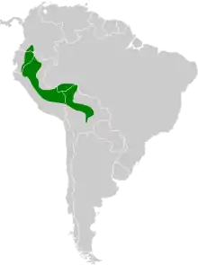 It is found along the east Andean slope and adjacent Amazonian lowlands from southern Colombia south through Ecuador and Peru to northern Bolivia and far south-western Brazil. X. o. chunchotambo occurs in central Peru, X. o. brevirostris in south-east Peru, northern Bolivia and south-western Brazil, and X. o. napensis in southern Colombia, eastern Ecuador and north-east Peru.[3][8] It is found in humid forests where it forages in the lower and middle storeys of the forest, often in mixed-species feeding flocks.[6][7]