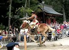 Tsurugaoka Hachimangū is the center of much cultural activity and both yabusame, (archery from horseback), and kyūdō (Japanese archery) are practiced within the shrine.[8] It also has extensive peony gardens, three coffee shops, a kindergarten, offices and a dōjō. Within its grounds stand two museums, the Kamakura Museum of National Treasures, owned by the City of Kamakura, and the prefectural Museum of Modern Art.