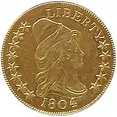 The Turban Head eagle, also known as the Capped Bust eagle, was a ten-dollar gold piece, or eagle, struck by the United States Mint from 1795 to 1804. The piece was designed by Robert Scot, and was the first in the eagle series, which continued until the Mint ceased striking gold coins for circulation in 1933. The common name is a misnomer; Liberty does not wear a turban but a cap, believed by some to be a pileus or Phrygian cap (Liberty cap): her hair twisting around the headgear makes it resemble a turban.