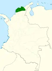 Turquoise-winged parrotlets are found in northern Colombia from the Caribbean coastal region southwest of the Santa Marta Mountains, Atlantico, and south along the Rio Magdalena in Bolívar and Cesar.[2]