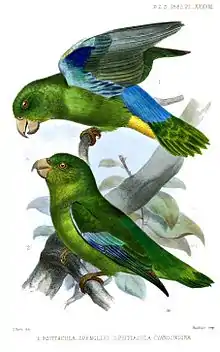 | Illustration of a turquoise-winged parrotlet (Forpus spengeli) (top) and green-rumped parrotlet (Forpus passerinus) (bottom) | |