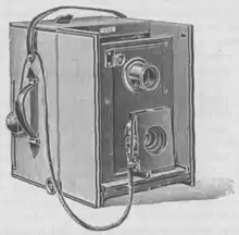 The photographer first viewed the image on a screen of ground glass. After adjusting the camera and closing the objective aperture the ground glass screen was swapped for the photographic plate, and finally the picture could be taken. (Some cameras used this layout as late as the 1960s, for example the Koni-Omegaflex.[2]) The additional viewfinding optics made it possible for a photographer to snap a picture immediately after focussing the image.[3] This advantage of course applies to SLR cameras as well, but early SLR cameras caused delays and inconvenience to move the mirror needed for viewfinding out of the optical path to the photographic plate. When this process was automated, the movement of the mirror could cause shake in the camera and blur the image. Using a mirror to allow viewing from above also enabled the camera to be held much more steadily against the body than a camera held with the hands only.