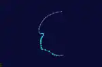 A strong and long lived tropical cyclone for December, the initial low level center for the system formed southwest of Ponape on December 4. By December 7, it had moved southwest of Truk without further development. By the morning of December 10, its structure was improving, and by the next afternoon a tropical depressions had formed. Late on December 11, it had evolved into a tropical storm. A slow moving system, Kit shifted from the northwest to a westerly heading, passing just south of Guam without any further development. Intensification resumed on the following two days reaching its first peak in intensity on December 16. The storm moved sharply northward for a second time at a slow rate of motion before resuming its westward motion due to a northeast surge in the trade winds. Reintensification occurred as the upper trough to its north acted as an outflow channel. Kit reached its peak intensity on the evening of December 17 before increasing westerlies aloft began to weaken the cyclone. On December 20, the surface circulation began to emerge south of its central convection. Thereafter, Kit was steered the low-level flow to the south and southwest as a deck of stratocumulus. On December 21. Kit became a tropical depression once more and by afternoon no longer qualified as a tropical cyclone. Late on December 22, the low level cloud swirl moved into Mindanao before dissipating.[3]