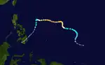 Super Typhoon Irma developed from the near-equatorial trough on November 17. As a tropical depression, it headed westward, and steadily intensified, first to a tropical storm on November 19, later to a typhoon on November 20. Irma quickly strengthened on November 22 to a super typhoon with maximum winds of 135 knots (250 km/h), but its outflow was disrupted by the Philippines to the southwest. Irma hit the northern Philippines on November 24 with maximum sustained winds of 85 knots (157 km/h), and rapidly weakened over the country. As a weakened tropical storm, Irma turned northeastward, where it was absorbed by a cold front on November 27. A total of 409 fatalities[4] and $9 million in damage (1981 USD) can be attributed to the typhoon.[3]