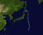 An area of convection active for the previous 48 hours led to the formation of a low level circulation near 23°N 151°E / 23°N 151°E / 23; 151 early on July 27. Gradual intensification ensued, and the system developed into a tropical depression that evening, a tropical storm on July 28, and a typhoon by July 31 as it moved west-northwest. The cyclone struck southern Kyūshū, in Japan, early on July 31 which weakened the cyclone. The tropical storm then moved into the East China Sea which continuing to spin down. Upper-level wind shear took its toll, leading to its weakening into a tropical depression and its ultimate dissipation in the Yellow Sea along the west coast of Korea.[3]