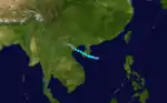 A tropical disturbance organized into a tropical depression east of the Philippines on June 28. It tracked westward, reaching tropical storm on June 30 before hitting the central Philippines. Kelly weakened over the islands, but restrengthened in the South China Sea, attaining typhoon status on July 2. The typhoon hit southern Hainan Island on July 3, bringing wind gusts to 54 knots (100 km/h) at Tate's Cairn in Hong Kong.[2] The cyclone then crossed the Gulf of Tonkin as a weakening tropical storm, and made landfall on northern Vietnam on July 4 as a tropical storm with maximum sustained winds of 35 knots (65 km/h). Kelly dissipated the next day, after causing torrential flooding and mudslides, resulting in 200 casualties and leaving thousands homeless.[3]