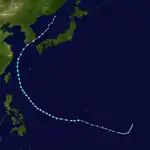 Super Typhoon Page formed on November 21 as a tropical depression. From there, it tracked slowly westward, making a cyclonic loop. Page continued westward, and strengthened into a Category 5 typhoon. It then accelerated northeastward, making landfall in Japan on November 30 as a Category 1 typhoon. Page dissipated over northeast Japan on December 3.[18]