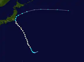 Shanshan began as a depression east-northeast of Guam on August 2. At 21:00 UTC (GMT+10) on the same day, the Joint Typhoon Warning Center (JTWC) began tracking the system, giving it the identifier 17W.[1] 17W intensified into a tropical storm on August 3, with the Japan Meteorological Agency assigning it the name Shanshan.[2] The storm was located over a favorable environment as the system was gradually consolidating,[3] and it intensified into a severe tropical storm on August 3. The following day, both the JMA and JTWC upgraded Shanshan to a typhoon after deep convection was seen wrapping into its developing center. The JMA later determined that the storm had peaked in intensity with 10-minute winds of 130 km/h (80 mph) and a minimum pressure of 970 hPa, and expected the storm to maintain that intensity for several days. The JTWC stated that Shanshan had slightly weakened after a strengthening trend by August 6 after its eye became ragged and slightly displaced. On August 7, Shanshan began to re-intensify and reached its peak strength as a Category 2 typhoon with 1-minute winds of 165 km/h (105 mph) while nearing southeastern Japan. Thereafter, Shanshan began to change course towards the east as it rapidly weakened. The JTWC issued their final advisory on August 9, although the JMA tracked the system until it became extratropical at 06:00 UTC on August 10.