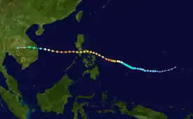 After peaking, Trix began a weakening process at 1800 UTC the next day, with its winds down to 210 km/h (130 mph), equivalent to a high-end Category 3 typhoon.[1] The system subsequently inclined northwestward and degraded further until it made landfall over the Bicol Region before it traversed the central parts of the Philippines on October 21 and 22.[3] Upon the system clearing the country and emerging into the South China Sea that day, Trix reintensified to a Category 4 storm, achieving the same peak winds before it weakened progressively for the final time as it slowly approached Vietnam. The system was down to a tropical storm as it made its final landfall over the present-day Quảng Ngãi Province, Vietnam before the JMA ceased advisories on Trix inland at 1200 UTC of October 25; the JTWC continued to track the system until they stopped tracking the cyclone while over Surin Province, Thailand.[1][2][3]