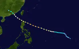 While tracking across the Philippine Sea, many tropical cyclone forecast models showed Warren tracking northward near Taiwan and eventually recurving out to sea. Forecasters at the JTWC continued to predict a westward motion because satellite imagery and mid-level synoptic analysis showed a subtropical ridge to its north.[2] According to the JTWC, the typhoon weakened slightly on July 17, though data from the JMA suggested that Warren maintained its maximum intensity[6] until Warren skirted Luzon that evening. Land interaction resulted in some weakening,[2] with the JTWC and JMA lowering the intensity of the typhoon to 175 km/h (110 mph) and 145 km/h (90 mph) at 00:00 UTC on July 18.[6] After entering the South China Sea,[7] Warren made landfall near the city of Shantou on the morning of July 19.[2] At the time, the JTWC estimated winds of 135 km/h (85 mph) while the JMA reported winds of 120 km/h (75 mph).[6] The storm rapidly weakened overland, and the storm dissipated on July 20 over the province of Guangdong.[7]