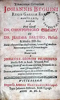 - ↑ Beguin, Jean (1983). Tyrocinium Chymicum. Translated by Russell, Richard ([1669 edition facsimile] ed.). Heptangle Books. ISBN 0-935214-05-4.
