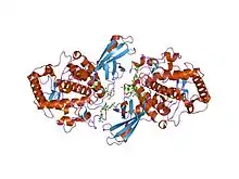 Tyrosinase is an oxidase that is the rate-limiting enzyme for controlling the production of melanin. The enzyme is mainly involved in two distinct reactions of melanin synthesis otherwise known as the Raper Mason pathway. Firstly, the hydroxylation of a monophenol and secondly, the conversion of an o-diphenol to the corresponding o-quinone. o-Quinone undergoes several reactions to eventually form melanin.[5] Tyrosinase is a copper-containing enzyme present in plant and animal tissues that catalyzes the production of melanin and other pigments from tyrosine by oxidation. It is found inside melanosomes which are synthesized in the skin melanocytes. In humans, the tyrosinase enzyme is encoded by the TYR gene.[6]