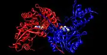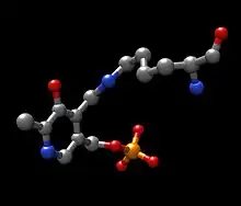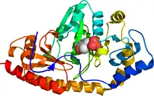 ![]() Human tyrosine aminotransferase (rainbow colored, N-terminus = blue, C-terminus = red) complexed with pyridoxal phosphate (space-filling model).[1] | |||||||||